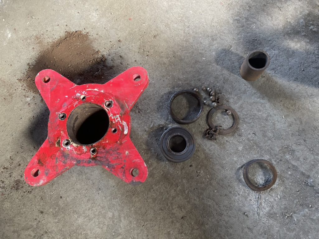 苦労しながら外してみますと、やはりベアリングがダメになっており、ここがスムーズに回転せず異音を出している箇所と分かりました。